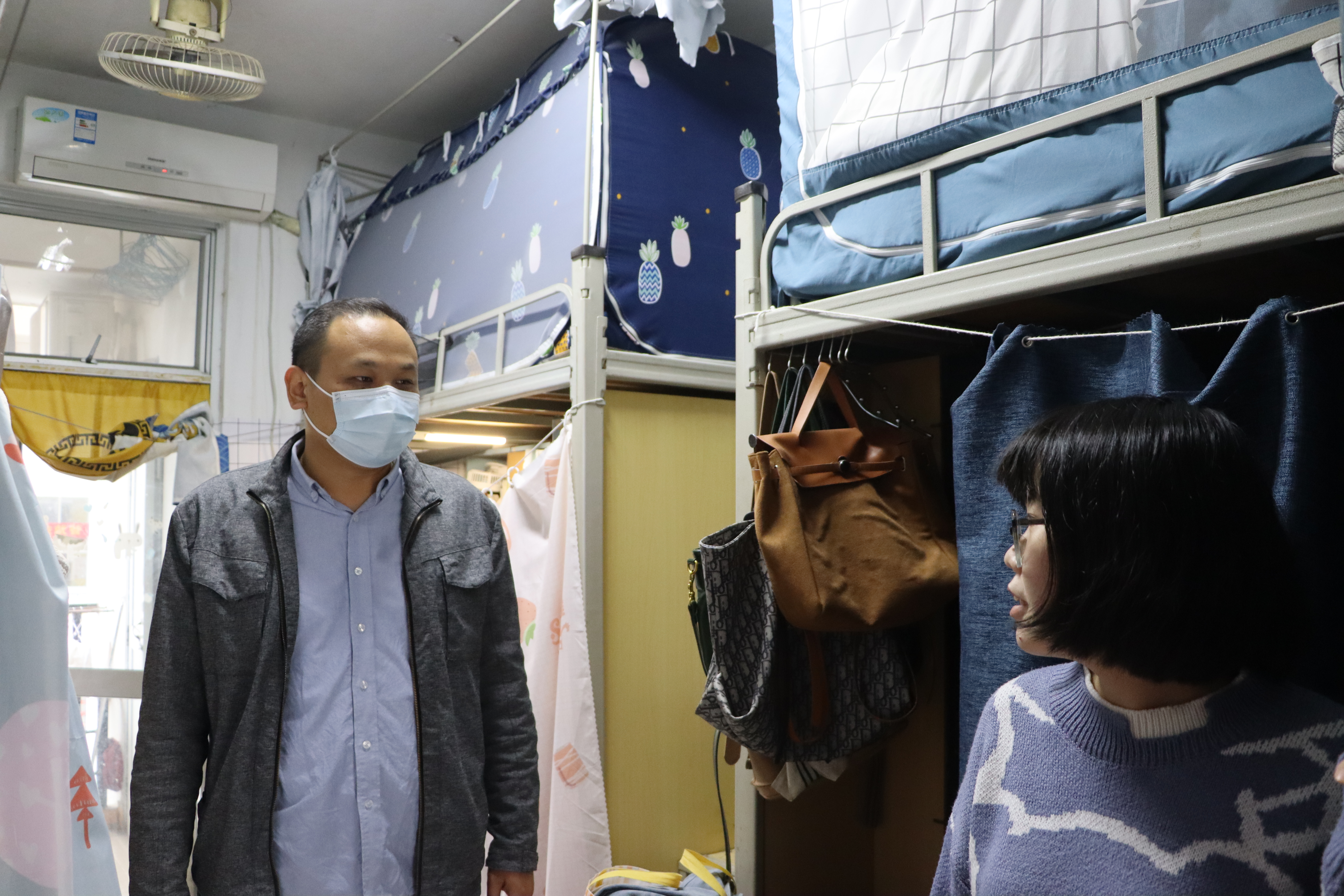 11月3日下午,学工办组织走访旗山、铜盘校区宿舍和学生活动室,了解疫情期间网课情况和学习生活状况。学工办一行逐一走访了每间宿舍,了解同学们对疫情期间的生活、学习是否适应,并对文明宿舍创建进行了现场检查督导。走访过程中,院党委陈永福副书记鼓励同学们要调整情绪心态,保持对学习的热爱,特别是考研的同学们要坚定信心、劳逸结合,以良好的心态备战考研。同时也嘱咐同学们勤洗手、多通风,配合每日核酸检测,共同筑牢校园疫情防线。